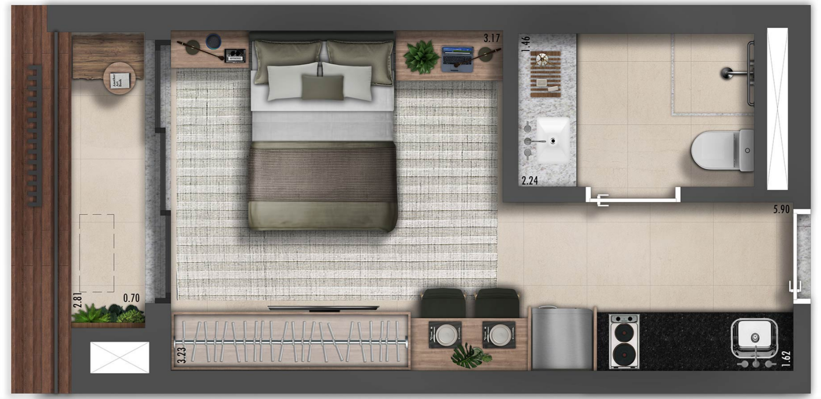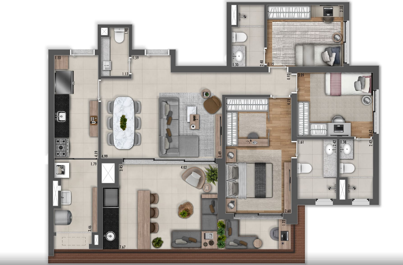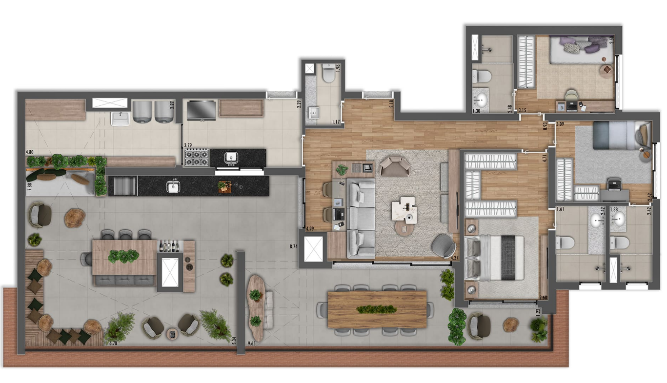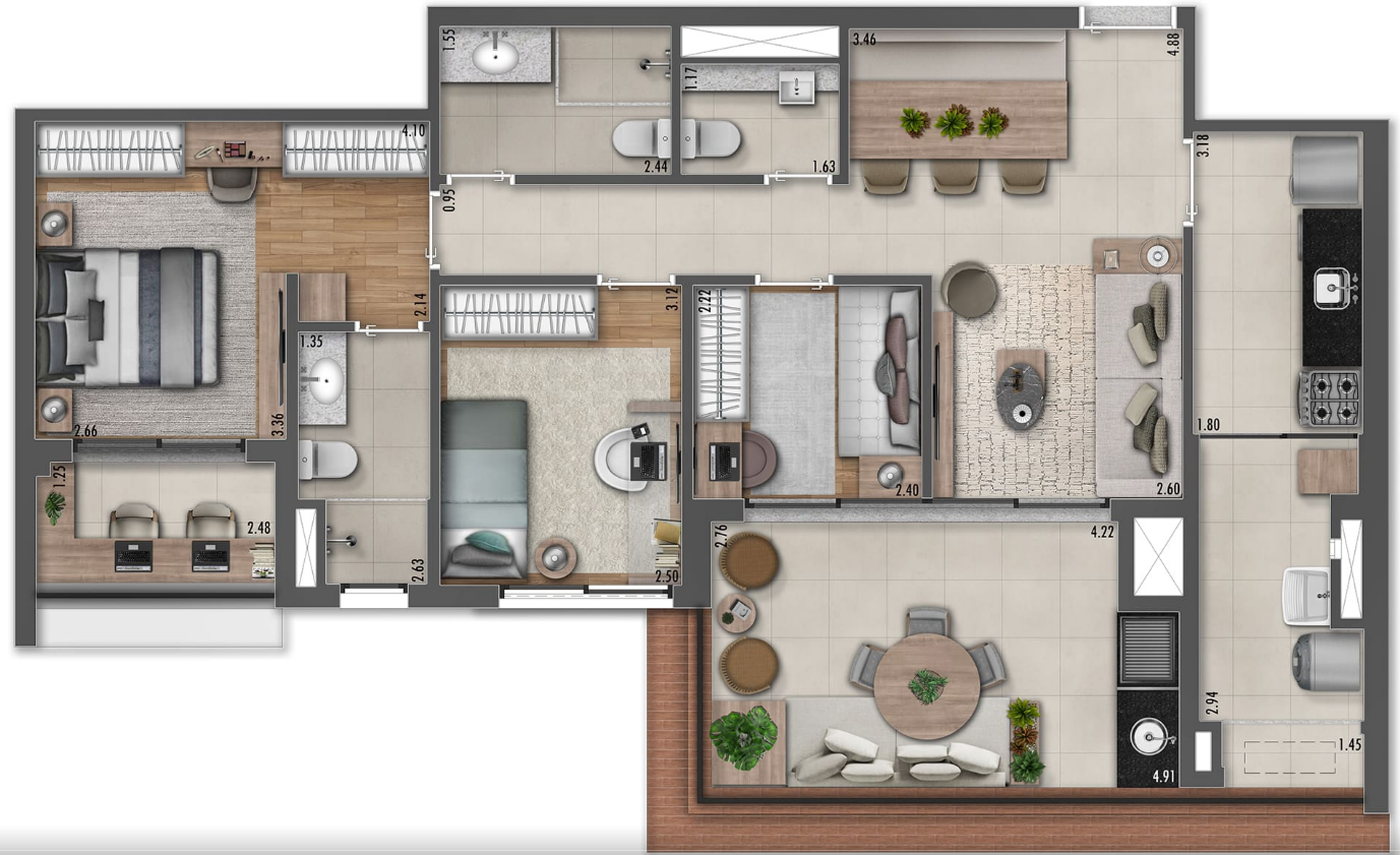 O condomínio possui uma única torre com 88 unidades, oferecendo uma variedade de opções: apartamentos de 95 m² a 113 m² com três dormitórios, gardens de 117 m² a 155 m², penthouses de 162 m² a 177 m² e studios de 24 m² a 28 m², todos pensados para garantir conforto e bem-estar aos moradores.